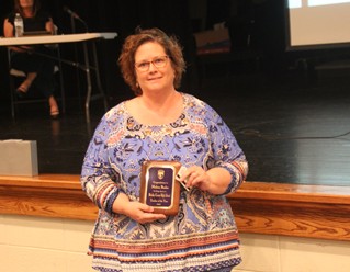 Smith then mentioned how District Teacher of the Year would normally be presented at the end of year staff meeting but that wouldn’t be possible due to social distancing guidelines. In a surprise move, Lori Belflower was announced as District Teacher of the Year. Family came forward for photos and congratulations.