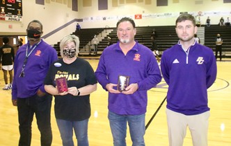 Friday night's game sponsors were Tony's Auto Body and Towing/Teston Auto Sales, At Home Senior Living, and DuBois and Friends. Pictured with boys head coach Garrett Collins are Mark Jenkins (DuBois and Friends), Kim Hall (At Home Senior Living), and Chris DuBois (DuBois and Friends.)