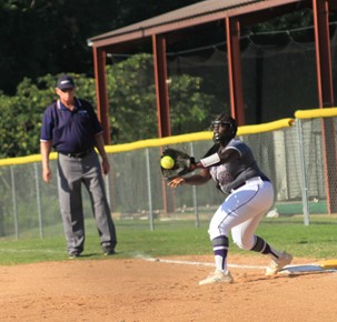 Elisia Vickers receives a ball at first base.
