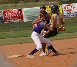 | Jada Davis tags out a Lady Chiefs player trying to take second base. |