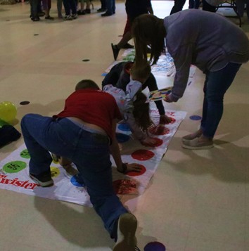 | The goal at math Twister was to put your hand (or foot) on the correct answer to the multiplication problem called out. |