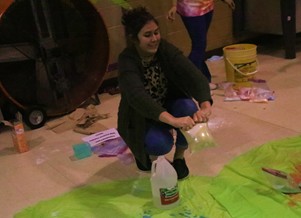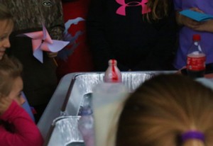 | McKensey Williamson tries to show what will happen when vinegar and flour are mixed together then shaken. |