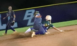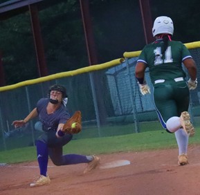 Emmie Williams tags out a player trying to steal second base.