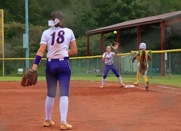 | Addison Hill watches Marley Jarrell cover a bunt at first base. |