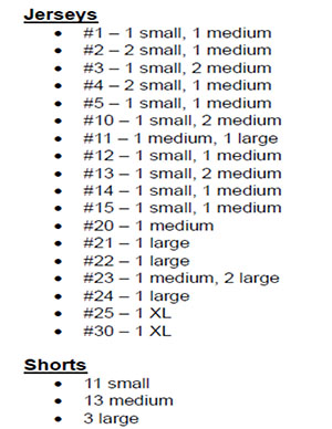 Prices are $40 per jersey and $40 per pair of shorts. Proceeds will go to the Tip-Off Club who pays for team meals during the season.