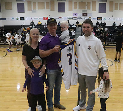 Allen's Tree Service was Saturday's game sponsor. Receiving the game jersey from boys head coach Garrett Collins is Tyler and Caley Allen.