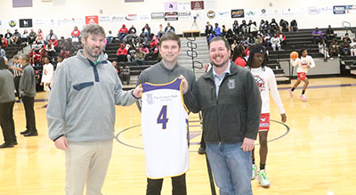 Citizens Bank of Cochran was Friday night's game sponsor. Presenting the game jersey to vice president BJ Coody( (left) and president Matt Fordham (right) is boys head coach Garrett Collins.