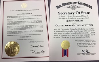 Currently, Tucker serves as the local FFA chapter Vice-President and the Area 3 FFA Vice-President. The commendation further states that he has “established himself as a leader in his school, local FFA chapter, and his community.” Ending the commendation, Governor Nathan Deal wishes Tucker the best in his future endeavors.