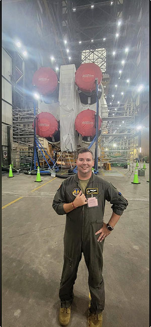 (Photo courtesy City of Cochran Facebook page.) Pictured is Maj. Zach Purser, an Air Force pilot stationed at Eglin Air Force base on Florida and Cochran native.. Purser gained national notoriety in November 2024 when he flew an F-15EX Eagle II as part of the ceremonial fly-over for the UGA vs Florida football game. A test pilot, Purser was recently photographed in front of the Artemis II spacecraft. The Artemis II marks the first deep space flight by NASA in over 50 years.