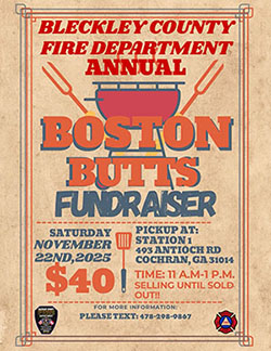 Bleckley County Fire Department Boston Butt sale ongoing.