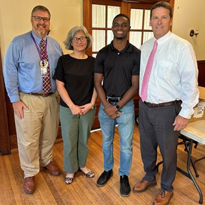 (Photo courtesy Bleckley County High School Facebook page.) Bleckley County High School senior Omar Bookal was recognized by Cochran Rotary Club as their student of the month for September at their meeting held this week. Bookal chose Chong Cairney as the teacher who had Impacted him the most during his time at BCHS. Pictured L-R are Principal Dr. Brad Knox, Chong Cairney, Omar Bookal, and School Superintendent Dr. Trey Belflower.