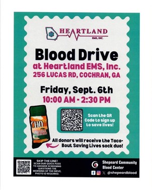 Shepeard Community Blood Drive at Heartland EMS September 6.