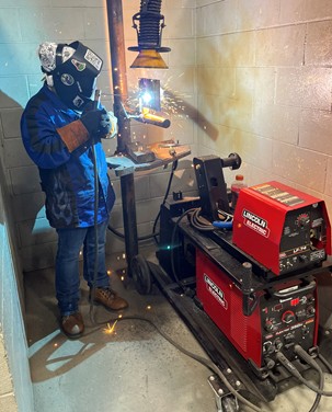 (Photo courtesy news release.) Oconee Fall Line Technical College welding students spend time in the lab to prepare them for work in the field. Pictured is Cochran student Angela Martin who is welding square butt joints in the vertical up position to prepare her for the root pass on her 3/8" 3G weld test.