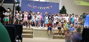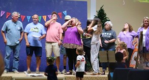 Children at Bethany Baptist Church had gone to a unique summer camp this week. The theme for Vacation Bible School was “Camp Firelight: A summer adventure with God.” Thursday night, they showed parents and others what they’d learned. Children and Student Pastor Kelly Hitchcock talked about the Bible stories the children learned each night and the songs that corresponded to the stories. A humorous moment happened at the end. The children were raising money for the Georgia Baptist Children’s Home. It was boys vs girls, with the adult leaders on the losing side having to eat crickets (to keep with the camp theme.) But because the children had reached the fundraising goal off over $600, both the top (coted on by the children) male and female leaders had to eat crickets. Thankfully, they were fried and not live.