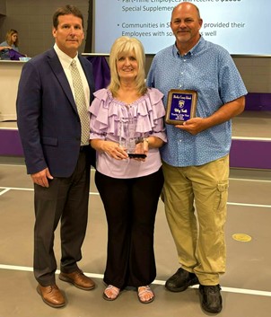 (Photo contributed.) Riley Troili was announced as Bleckley School District Teacher of the Year last Friday. She is a teacher at Bleckley Elementary. Troili is pictured with superintendent Dr. Trey Belflower and husband Freddy.