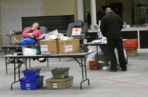The American Red Cross held a blood drive Monday afternoon at First Baptist Church. According to the promotional flyer, there is an "emergency" need for blood. As of about 5:30 pm, 33 people had donated. Several of them were walk-ups of people who worked at FBC.