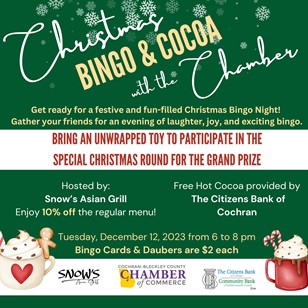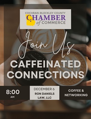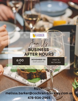 The Cochran-Bleckley Chamber of Commerce has several things happening in the next few weeks. This Thursday, they'll be doing Business After Hours at Heartland EMS from 6-8 pm. On December 6, another networking event will take place. Caffeinated Connections. It's at 8 am and will be held at the office of Ron Daniels Law. On December 12, the Chamber, along with Citizens Bank of Cochran, will host "Christmas Bingo and Cocoa at Snow's Asian Grill from 6-8 pm. For more information on these events, or how to join, call (478)934-2965 or email melissa.barker@cochran-bleckley.com