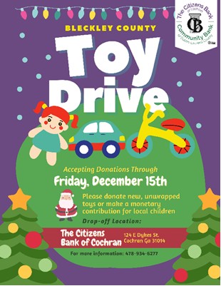 Citizens Bank of Cochran drop-off point for Toy Drive.