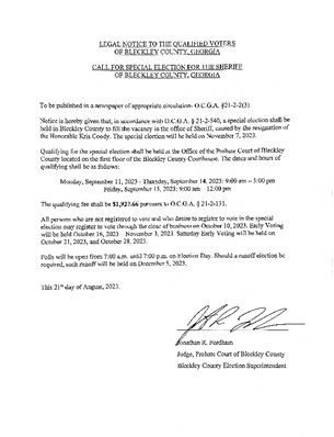 Call for special election to fill office of Bleckley County Sheriff.