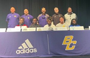 (Photo contributed.) BCHS held an athletic signing ceremony Wednesday afternoon in the auditorium. Athletes who will be continuing their careers at the next level are: Jahvon Butler and Nehemiah Mack, football, Thomas University. Enri Crawford, football, Bluffton University, Eli Mullis, baseball, Andrew College. Alex Norfleet, golf, Brewton Parker College. Ta’marian Robertson, football, Gordon State College, Da;Juna Rumph, Columbia College track and field.