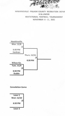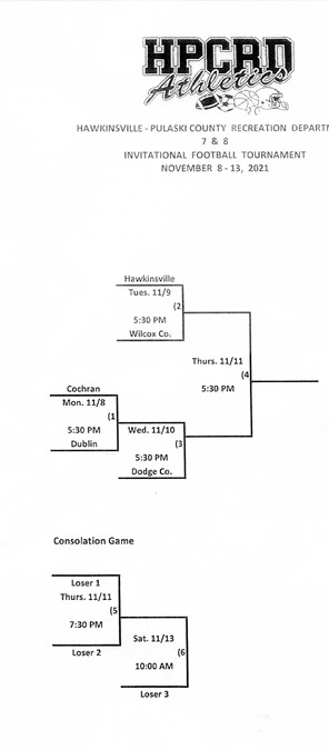 All three Cochran Bleckley Rec. Department All Star football teams will play in an invitational tournament in Hawkinsville starting November 8. Schedules for each division are posted.