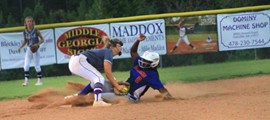 Darci Dillard tags out a player trying to take second base.