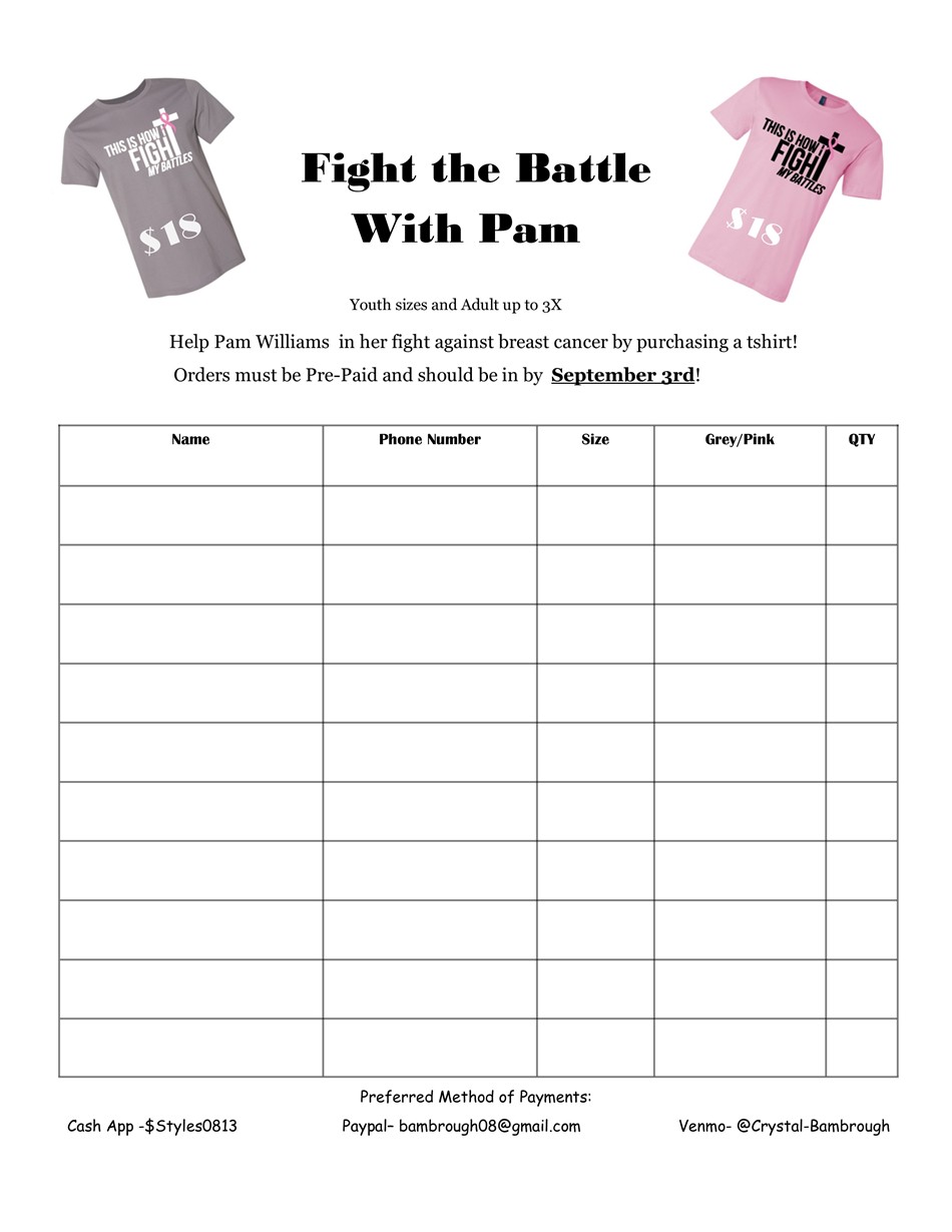 Pamela Williams is a local resident and survivor of breast cancer. The disease has returned. Family and friends are selling T-Shirts to aid with her expenses. Cost is $18 each. Payment methods are on the order form (click to download.) Shirts can be shipped for $4. Email crystalbambrough@gmail.com, melissaturman@ymail.com, or jlbeck82@outlook.com for more information.