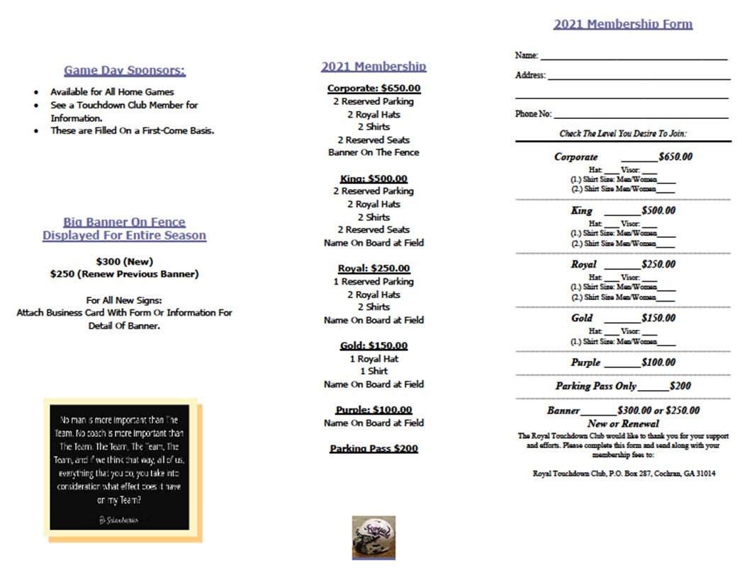 Membership form for 2021 Touchdown Club.