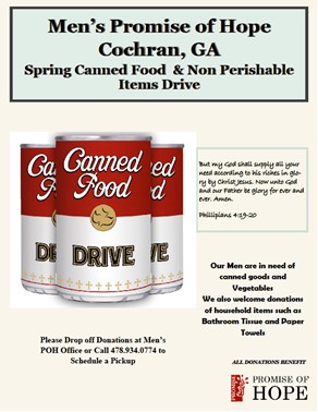 Promise of Hope men's facility seeking donations of canned food, non-perishable items.
