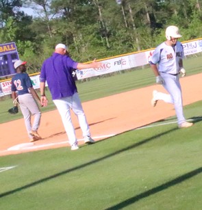 Brody Little comes home after hitting a solo home run in the second inning of game one.