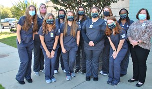 (Courtesy news release.) Erica Brantley of Cochran is part of Oconee Fall Line Technical College’s first ever diagnostic medical sonography cohort. The students spend lots of time in the lab with state of the art equipment which provides the knowledge and skills to be successful in the clinical setting where they observe and gain live experience. Those skills prepare students for entry-level sonographer positions in a variety of clinical settings including hospitals, outpatient clinics, and physicians' offices. Brantley is pictured first on the left.