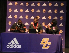 In what was a first for Bleckley County High School, a press conference was held Wednesday afternoon for Royals senior offensive tackle Amarius Mims to announce his decision on what school he committed to. Mims, the sixth-rated high school prospect in the nation, had received offers from numerous schools including UGA, Alabama, Tennessee, and Florida State. Flanked by parents Prentice Purnell and Nikki Mims, Amarius removed his jacket to reveal a University of Georgia shirt. He then proceeded to put on a chain with the “G” logo. His announcement was met by loud applause from many who’d gathered to watch.