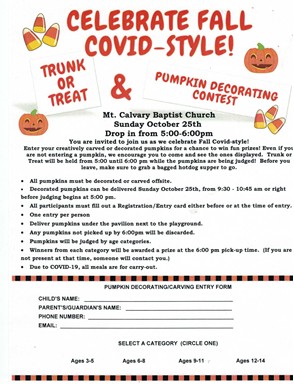 Local church holding trunk or treat, drop-in pumpkin carving contest October 25.