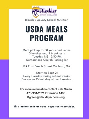 Bleckley School Nutrition to offer free meal pickup for kids 18 and under.