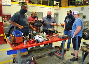(News release.) On Friday nights you might see David Grafton logging plays for Royals football. During the week, he’s a Diesel Equipment Technology major at Oconee Fall Line Technical College. Recently, he and other Diesel Equipment Technology Students were getting hands-on experience in the lab, testing the shift bar housing of an Eaton Fuller transmission to troubleshoot an issue of the transmission not shifting between high and low ranges, which can make the truck inoperable to haul freight. Being able to diagnose and troubleshoot the transmission of a truck properly is essential to truck operation. Grafton can be seen on the right.