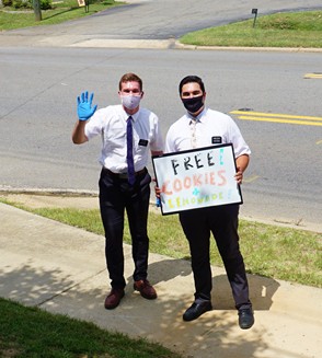 These two masked men were part of a group of missionaries from the Church of Jesus Christ of Latter-Day Saints. They were handing out free cookies and lemonade in an effort to help brighten people's day during what's a very difficult time for many due to the coronavirus pandemic.