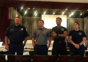 (Courtesy BleckleyProgress.com contributor.) Four members of Cochran Fire and Emergency Services were presented with awards for performing CPR on a Middle Georgia State University student in January, saving the student's life. Pictured L-R are: Sgt. Derek Warren, Lt. Ethan Cobb, Christopher Garlington, and McKayla Conner.