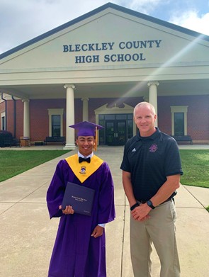 (Photo credit @BCHS_Royals Twitter.) Skyler White is the first graduate of the Bleckley County High School Class of 2020. White will be leaving Saturday to begin basic training in Paris Island, South Carolina. White is pictured with BCHS Principal Matt Gibbs.