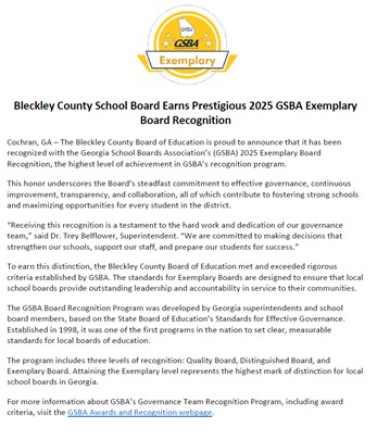 Bleckley School Board receives GSBA Exemplary Board recognition.
