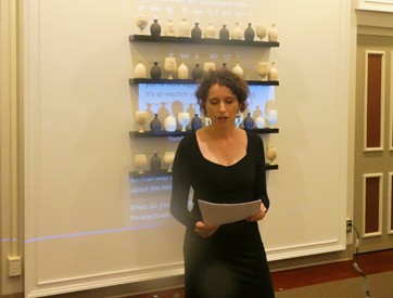 the Giuliano Sonata,” by artist Heatherly Day was held Monday night in Peacock Gallery. It was a unique exhibit, featuring both pottery and a video display. The display featured text messages between Day and her friend Giuliano who was a music teacher on the MGA Macon campus. The pieces on one set of shelves had words from the text messages between the two. Some of Giuliano ‘s piano music was the background music for the video display. He went home to Italy in 2023 after being diagnosed with cancer. One of the text messages show was from his sister texting her about his passing in 2024. Day took one of the pieces, blew in it, then smashed it to the ground. She said blowing in the piece was to symbolize giving it life, smashing it was the death and the grief from death. The exhibit will be there until October 31.